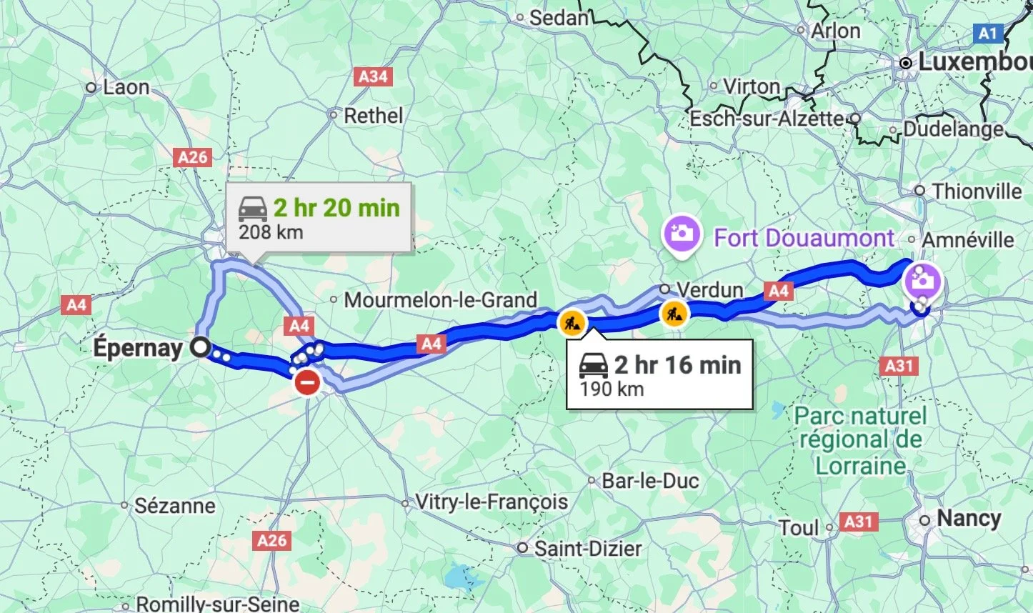Drive to first stop for lunch. Suggestions Epernay (1:45) Champagne region.